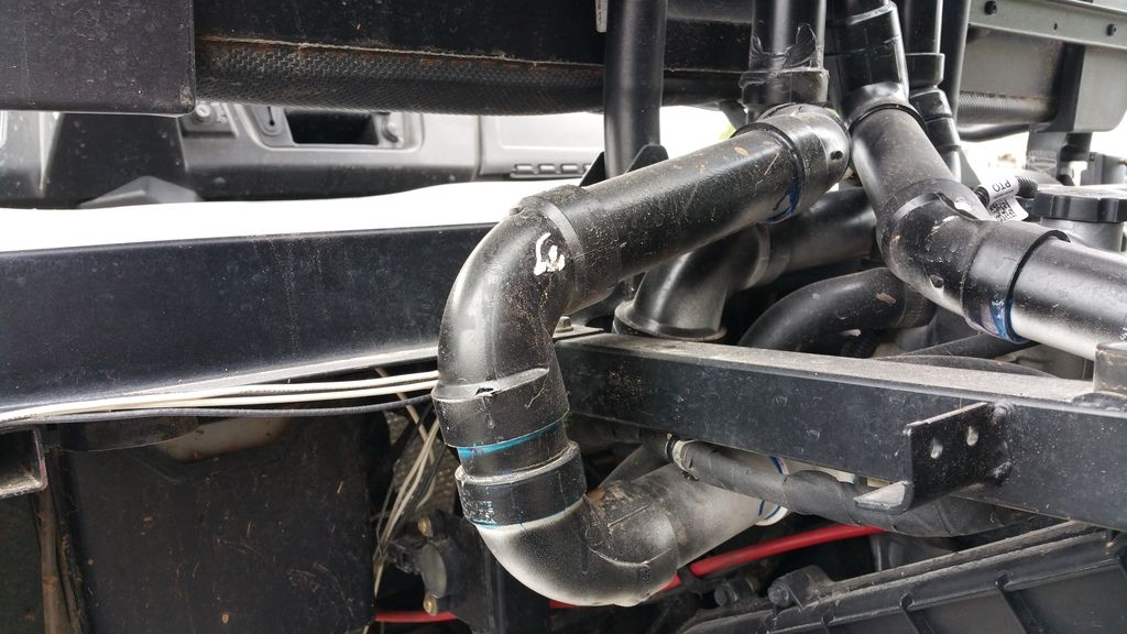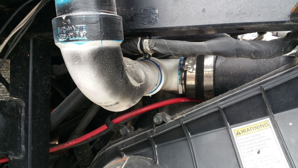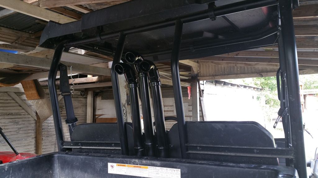 You need more then just a 90 on top of the snorkel. I stuck 90s on top of mine the first night I left it out (wasn't complete) but the belt housing was tied in and it rained, the belt box was full of water when I opened it. Glad I didn't have the intake tied in. I put 23 deg fittings then 90s on top of mine cause I had some leftover. 45s then 90s like on the snorkel your atv kit will work even better. and it looks good also.